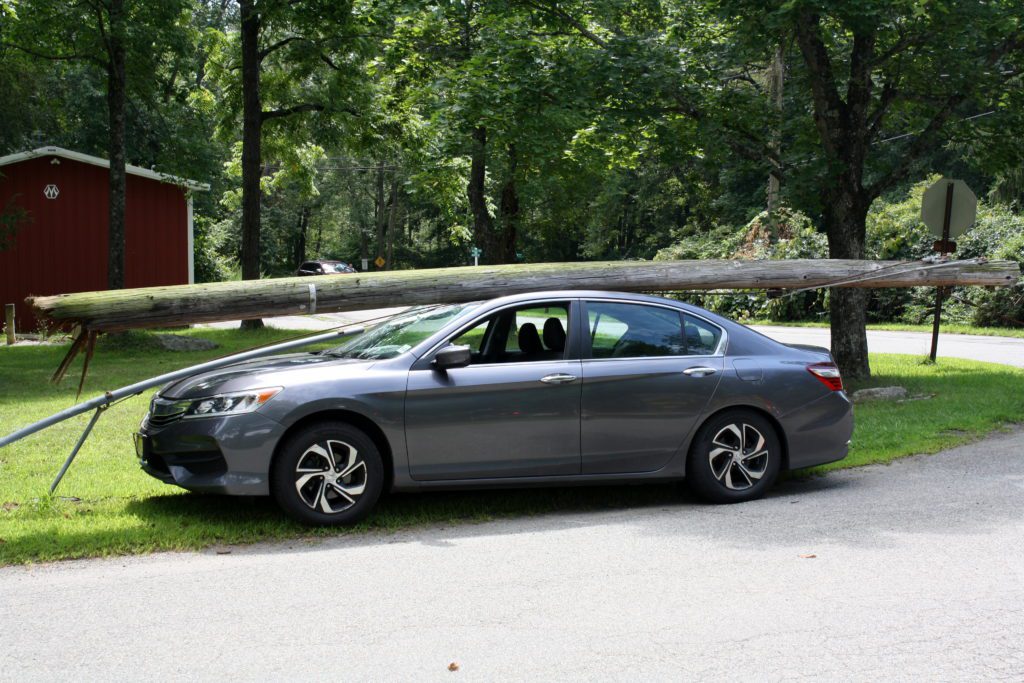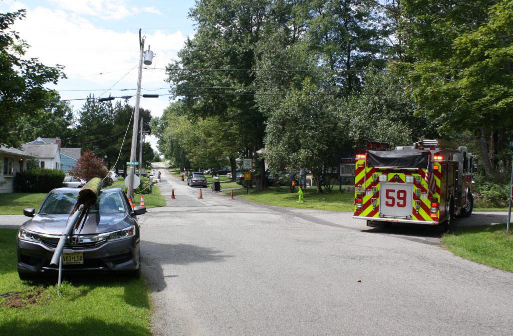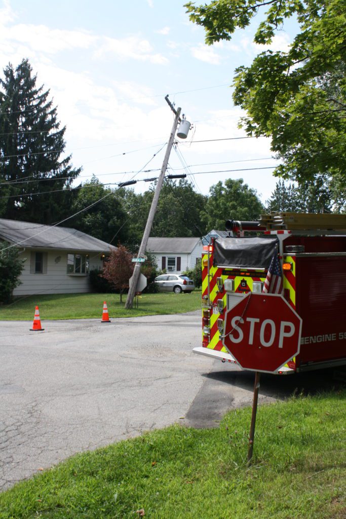 Recently in Vasa Park a car lost control and hit a telephone pole snapping it in half causing it to land on top of the car and almost pull down a second pole. The wires on the pole started the tree tops on fire. Engine 59 stood by for the power company to shut down power. The power was cut and the pole was removed. There were no injuries.