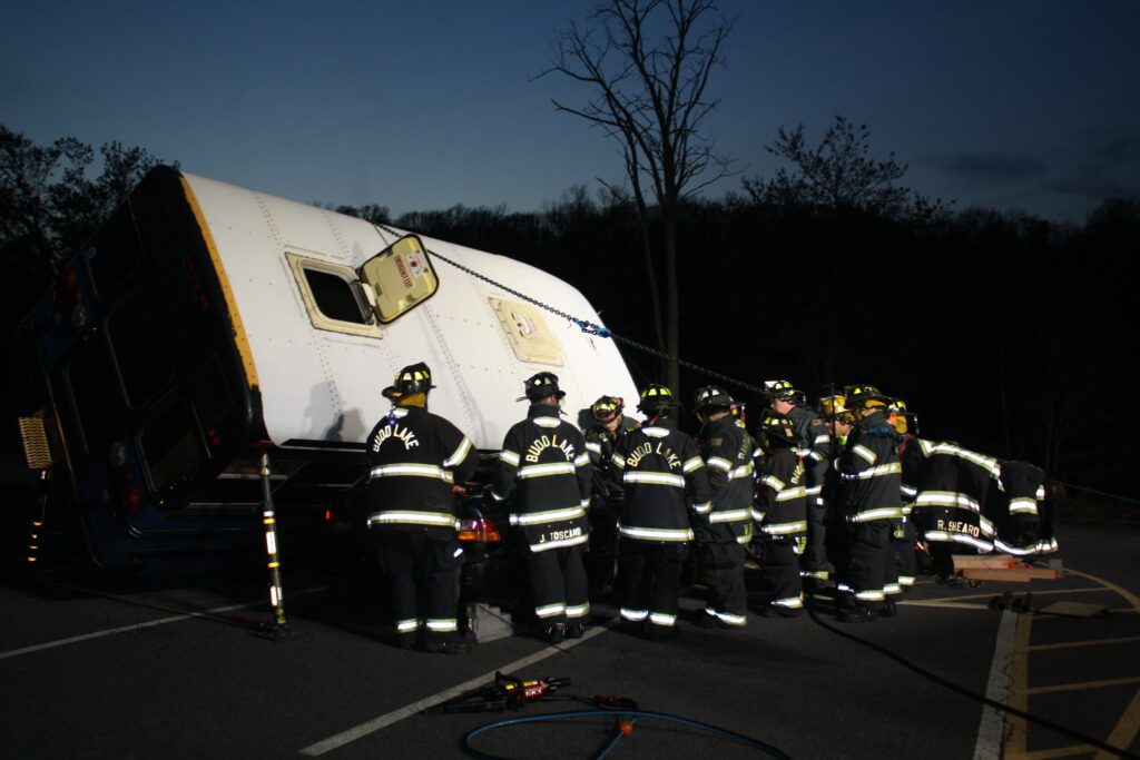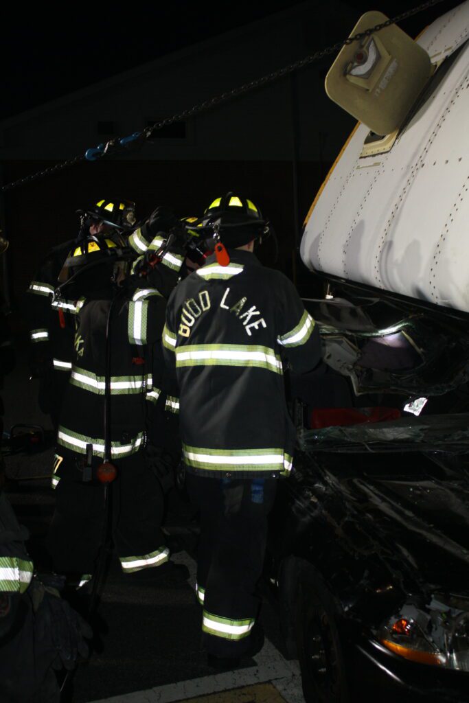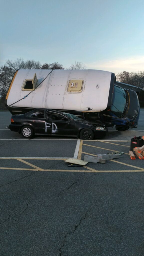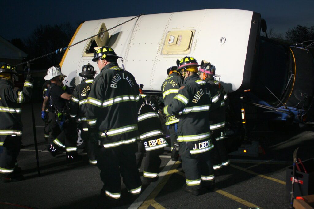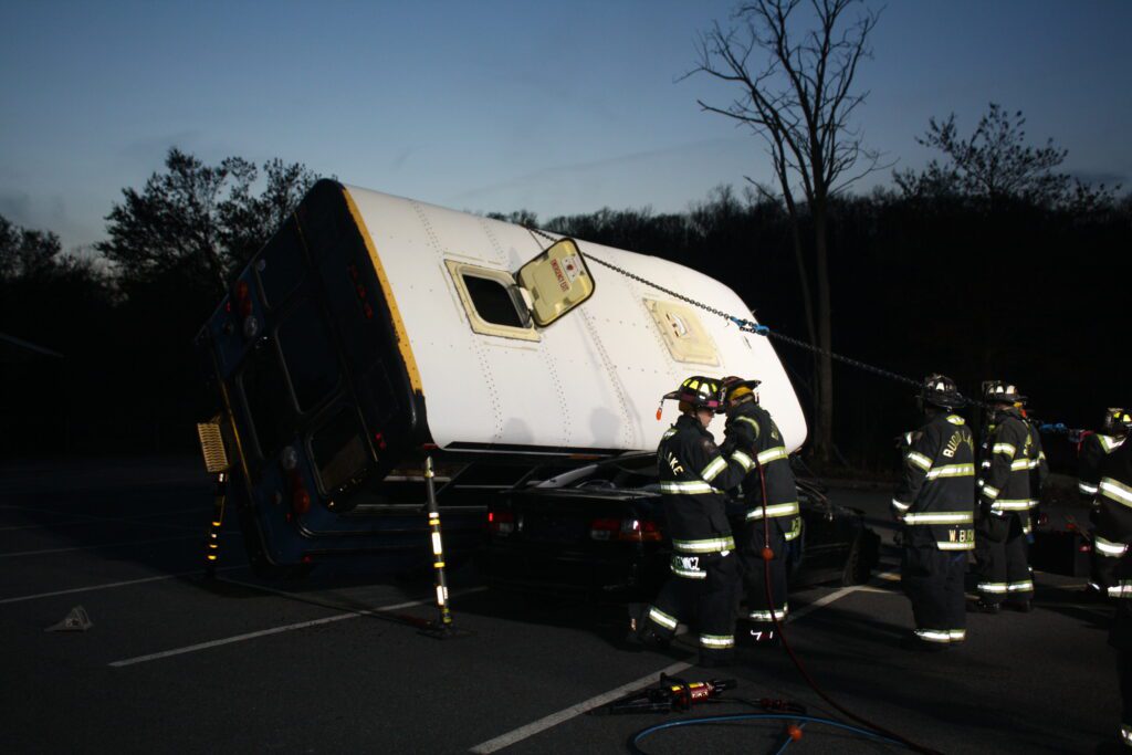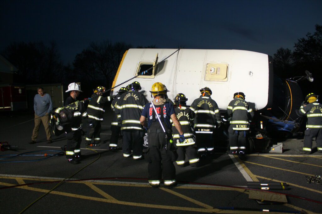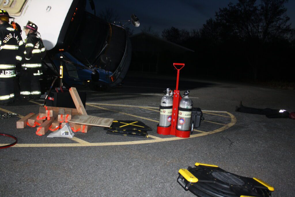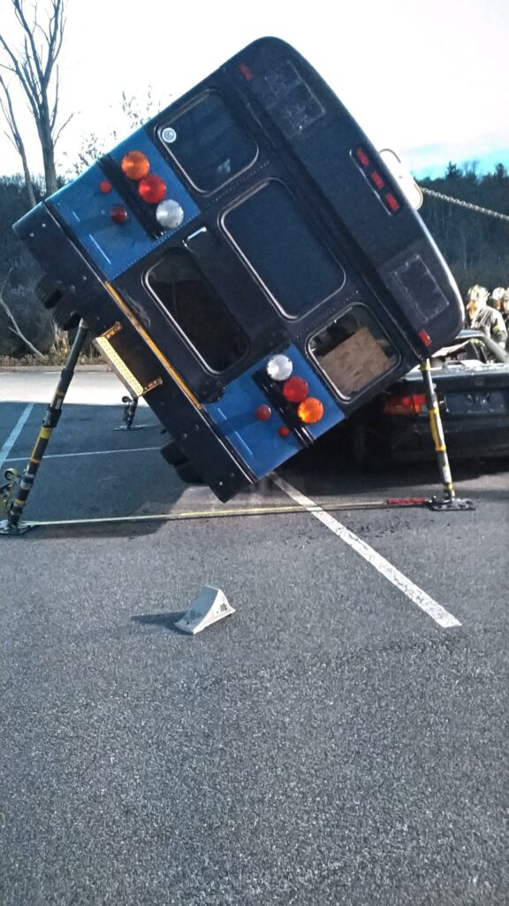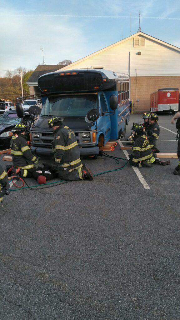 Recently the fire department drilled on the use of air bags and struts, using a donated school bus. The crew were given two scenarios one was a worker trapped under the front of the bus and the second one was a bus overturned on a car with people trapped. The crews used air bags to lift the bus and remove the person then in combination with the air bags, struts and jaws of life they stabilized the bus and the car secured the person in the car and then cut the person out of the car and removed them to awaiting EMS.