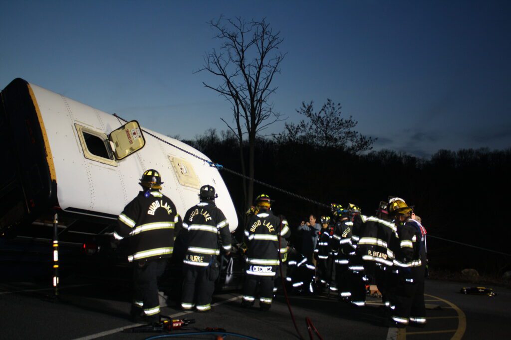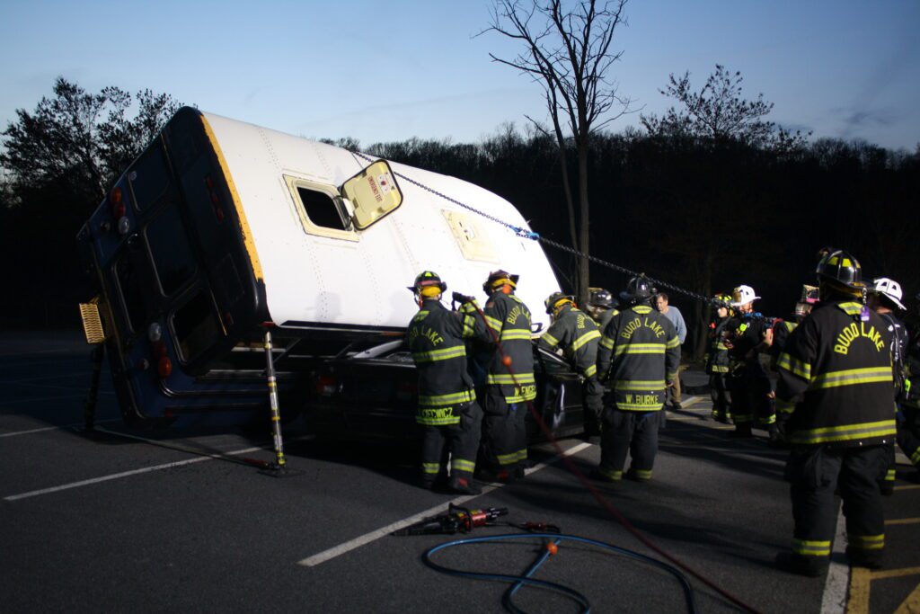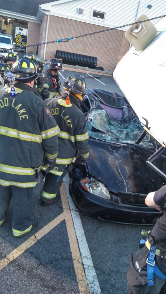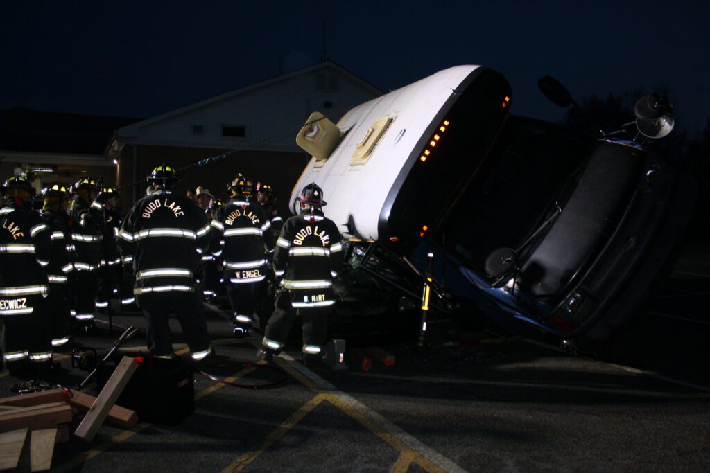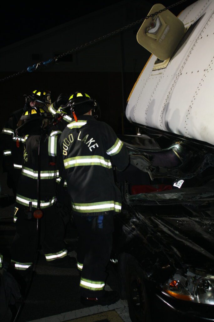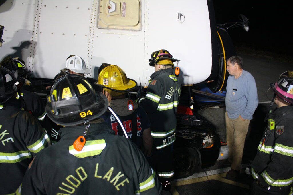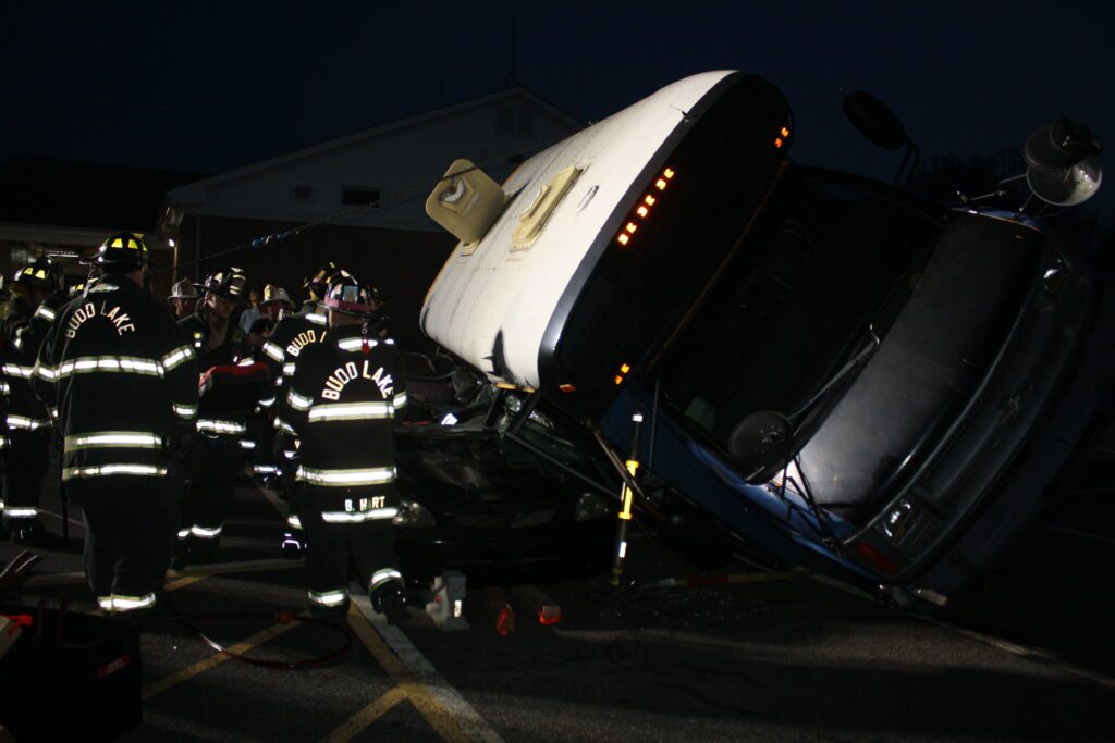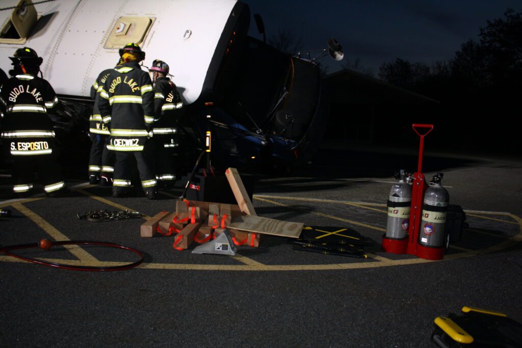 Recently the fire department drilled on the use of air bags and struts, using a donated school bus. The crew were given two scenarios one was a worker trapped under the front of the bus and the second one was a bus overturned on a car with people trapped. The crews used air bags to lift the bus and remove the person then in combination with the air bags, struts and jaws of life they stabilized the bus and the car secured the person in the car and then cut the person out of the car and removed them to awaiting EMS.