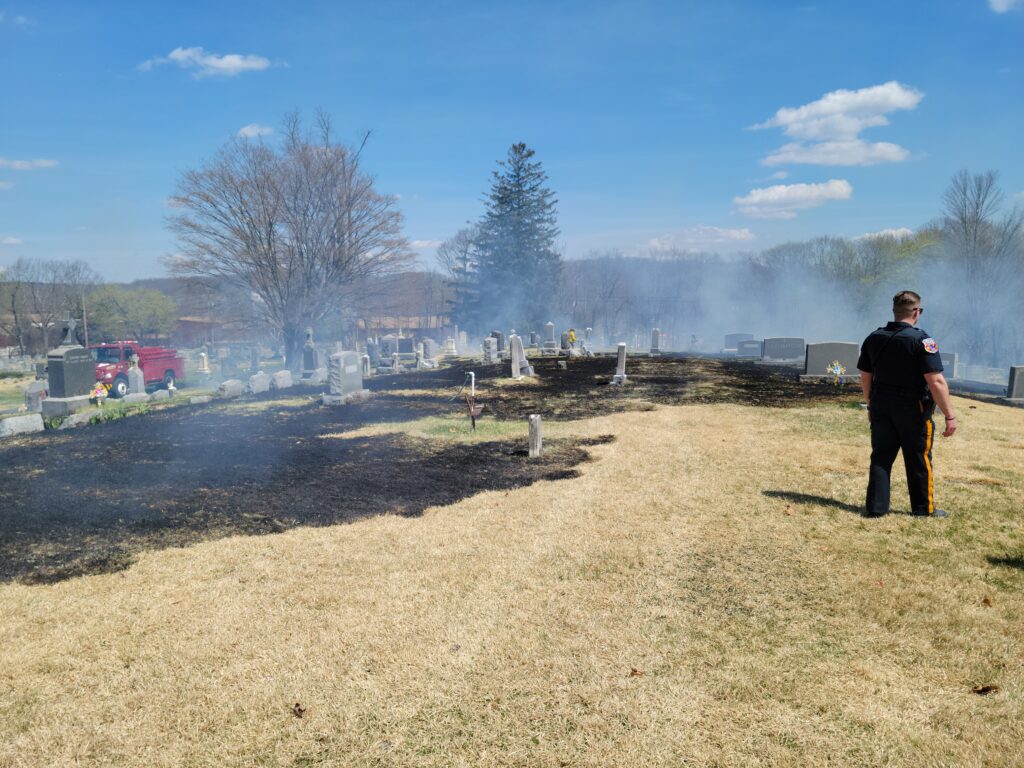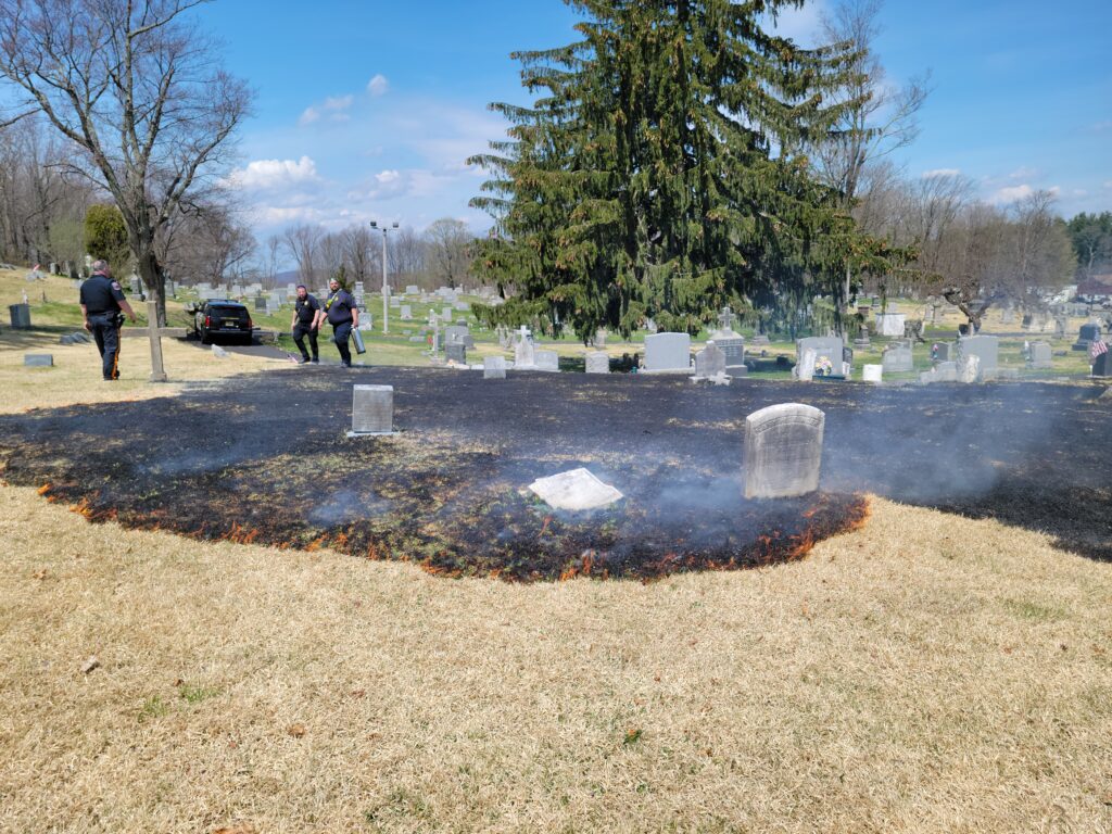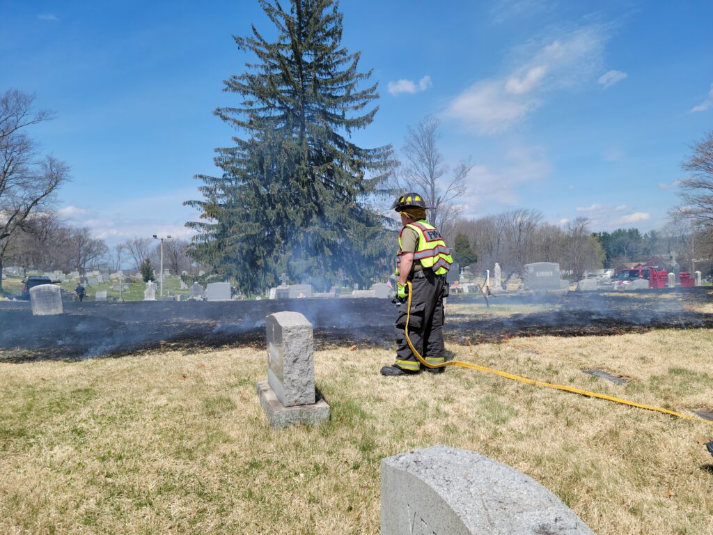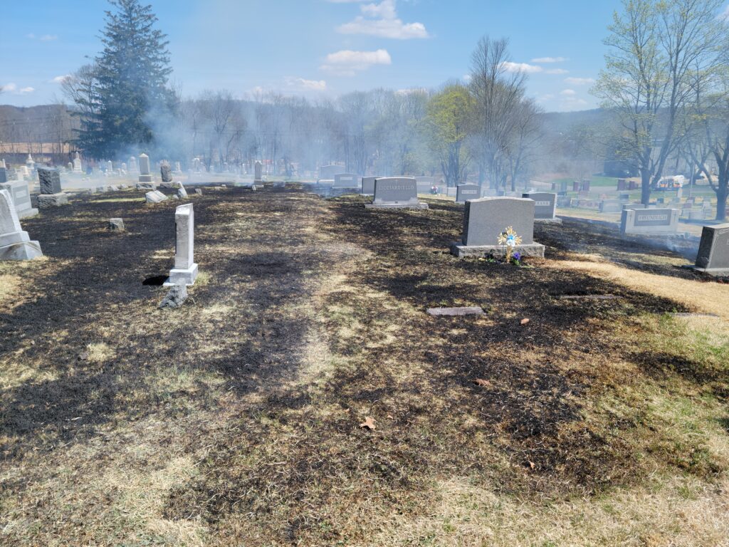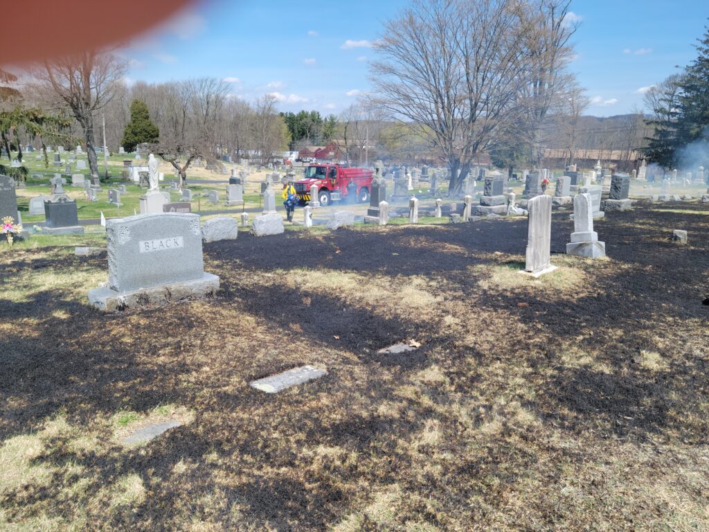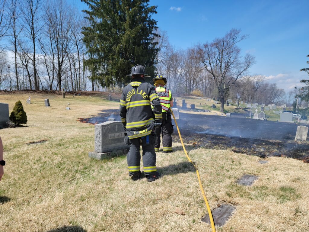 Thursday afternoon the department was dispatched to the Stanhope Union Cemetery on Continental Dr. for a brush fire upon the arrival of car 51 the fire had extended to 200 x 300 feet of grass burring around grave markers. Engine 53 arrived along with NJ Forest Fire and stretched forestry hose lines on the fire. Engine 95 and Brush 98 from Flanders Fire also assisted. The fire was knocked down within 15 minutes. There were no injuries reported and the forestry service is investigating.