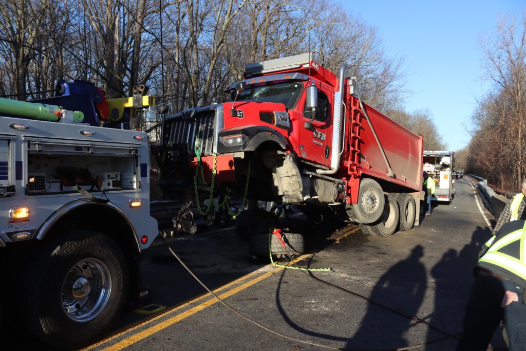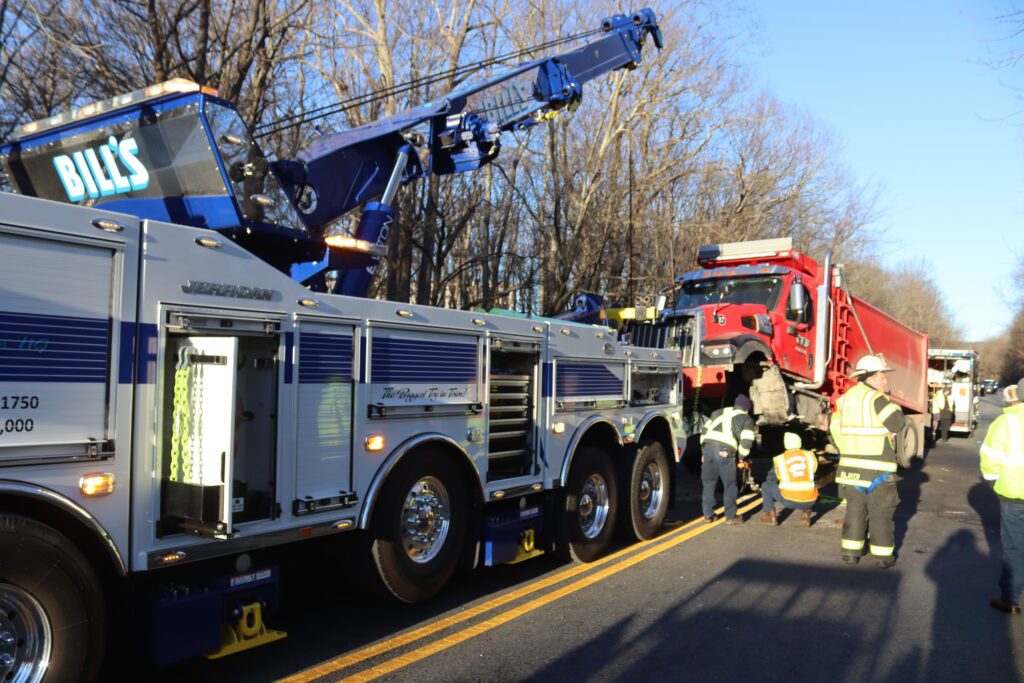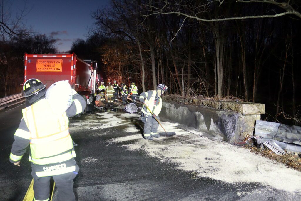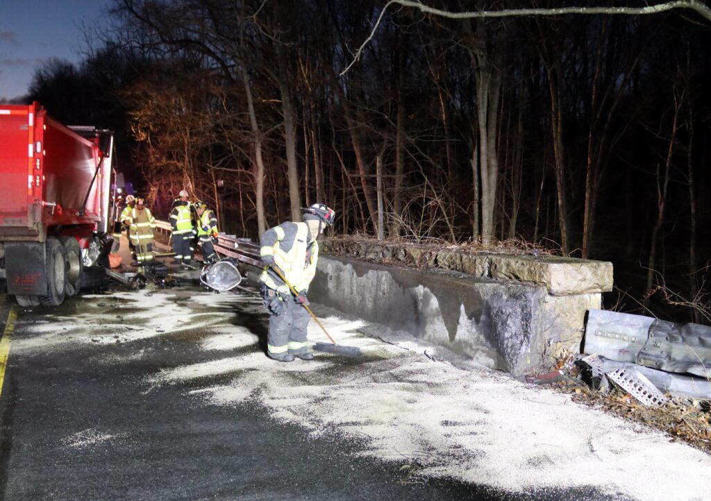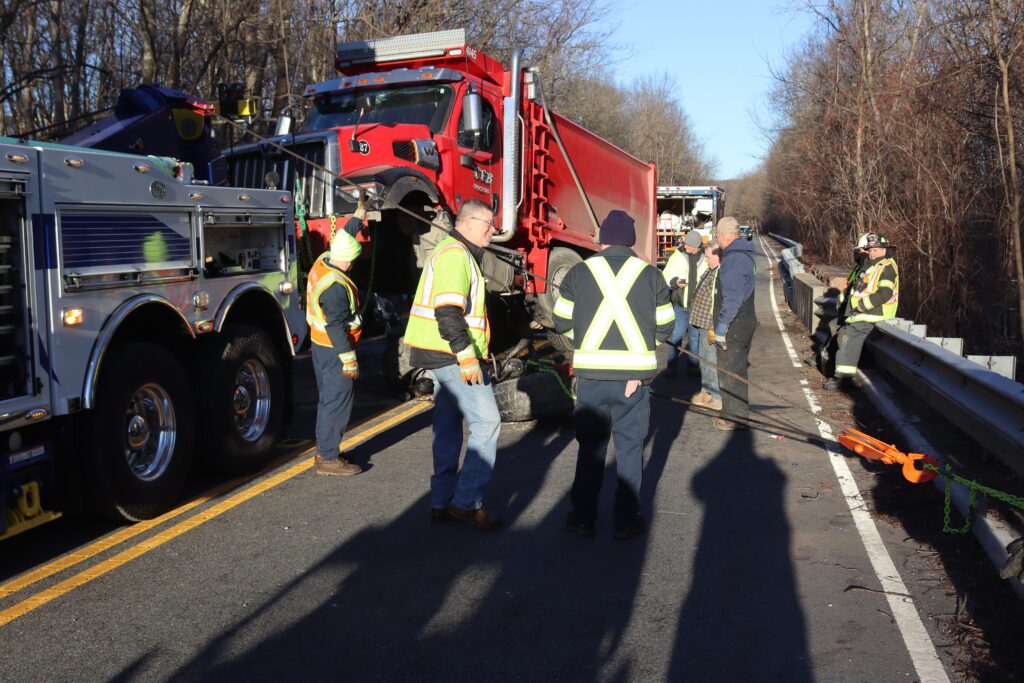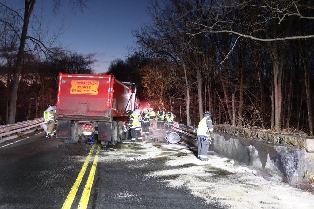 Early Monday morning a dump truck traveling on Continental dr. hit a bridge that is over the wills brook. The driver was not injured but the truck was heavy damaged. The trucks fuel tank was ruptured and spilled diesel fuel on the road and in the brook. The Morris County Hazmat, DEP and Flanders Rescue 97 assisted Engine 59 with cleanup and securing the truck.