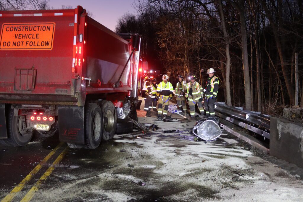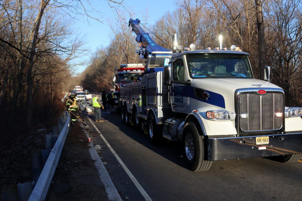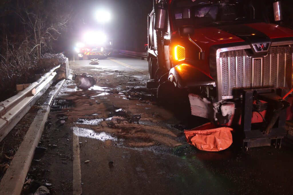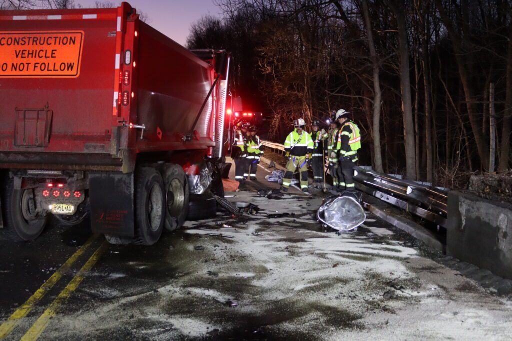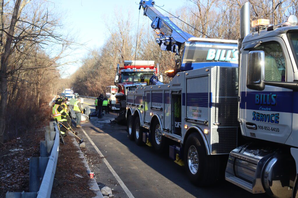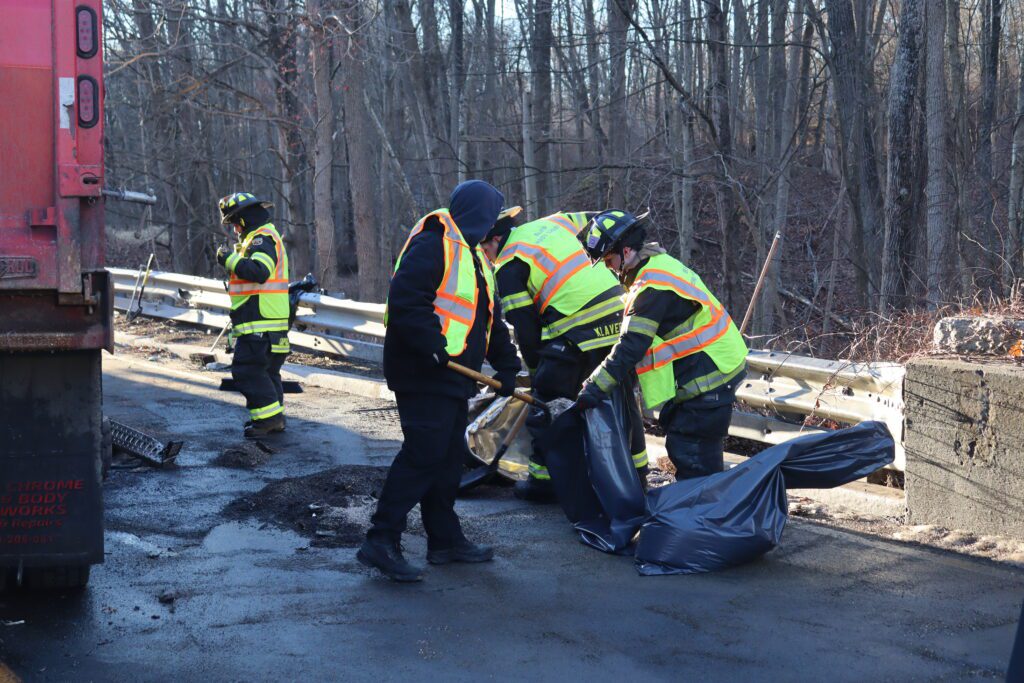 Early Monday morning a dump truck traveling on Continental dr. hit a bridge that is over the wills brook. The driver was not injured but the truck was heavy damaged. The trucks fuel tank was ruptured and spilled diesel fuel on the road and in the brook. The Morris County Hazmat, DEP and Flanders Rescue 97 assisted Engine 59 with cleanup and securing the truck.